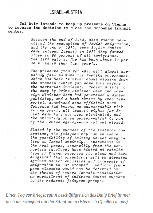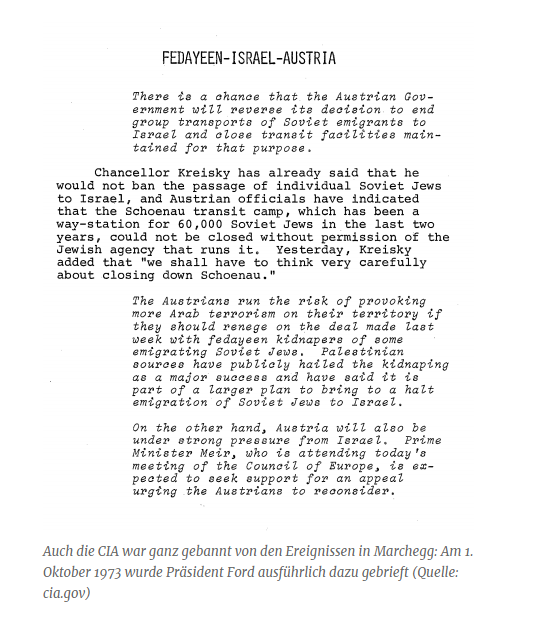 Kreisky zei ervan overtuigd te zijn dat de terroristen hun dreigement de gijzelaars te zullen doden zouden hebben uitgevoerd. „Sinds 1968 hebben Palestijnse terroristen 22 aanvallen gedaan, die resulteerden in 89 doden onder burgers, acht doden onder de terroristen en 106 gewonden", zo zei Kreisky. Als terroristische aanvallen zouden zijn ondernomen op het kamp Schönau, „zou Oostenrijk in de ogen van de bevolking zijn veranderd in een tweede oorlogstoneel in het Midden-Oosten conflict", zo meende de Oostenrijkse kanselier.